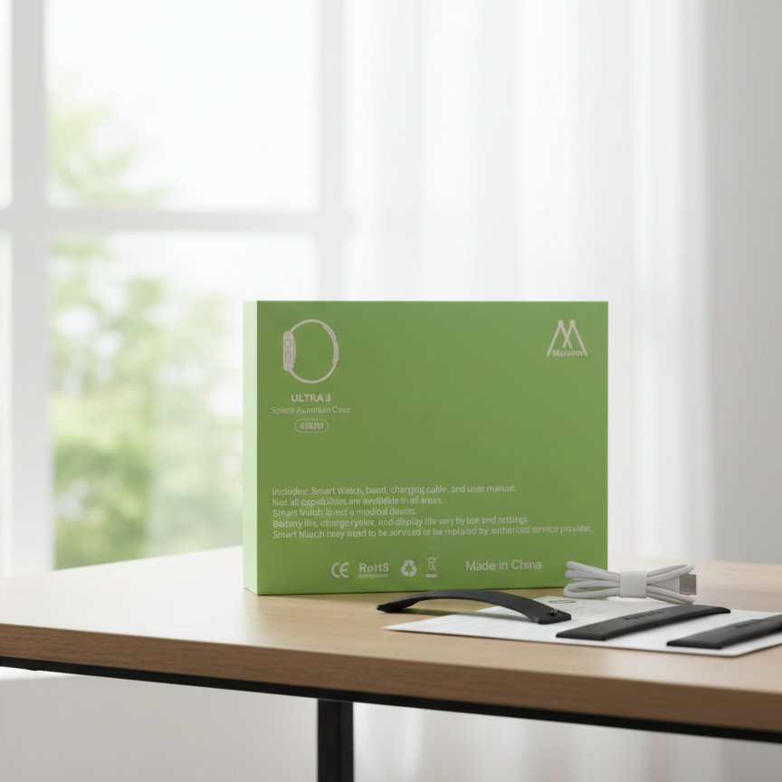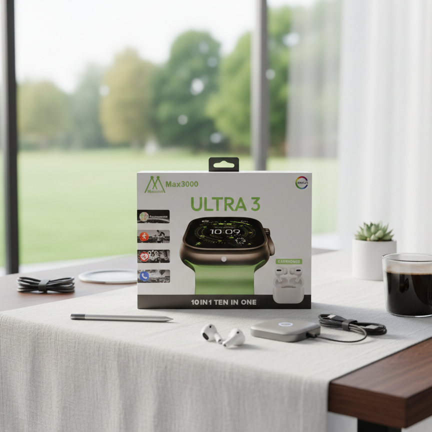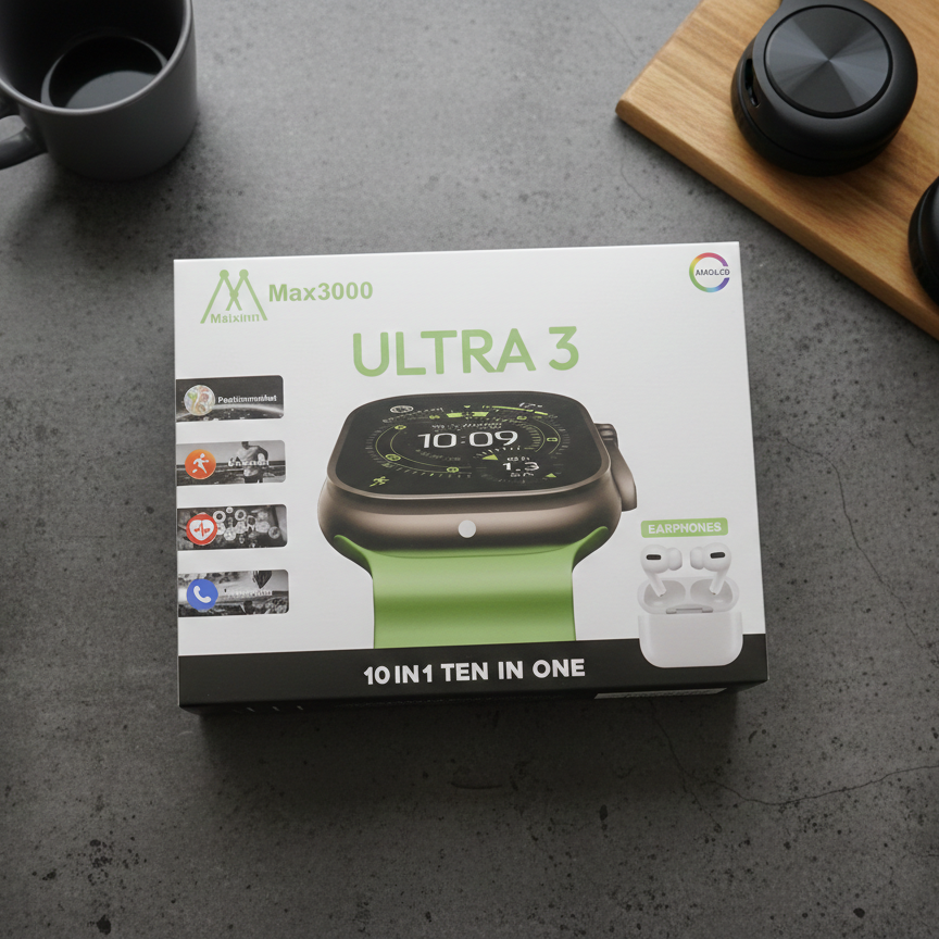 Maixinn Max3000 Ultra 3 Smart Watch Comes With A Clear AMOLED Display And A Modern Design. It Supports Multiple Functions Shown As 10 In 1 Ten In One. The Watch Includes Options Such As Position Market Movement Heart Rate And Phone Chat. The Product Is Presented With Earphones As Shown On The Box And Is Designed For Daily Smart Usage.